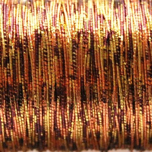 En vacker och glänsande tråd som ger effekt till ditt broderi. Tråden består av en bomullskärna och med en folie som är lindad runt. Tråden oxiderar inte och kan broderas genom tyg men går givetvis också att användas till läggsöm. Tänk på att använda en nål med tillräckligt stort öga för att inte rispa bort folien på tråden om du syr rakt genom tyget. Tråden innehåller olika mycket folie vilket gör vissa trådar mjukare och vissa något strävare. Priset är för 10 meter i härva.